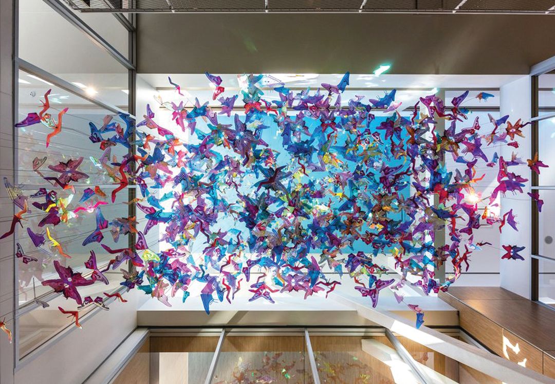 Located inside the Alief Community Center, this piece combines the ethereal and natural with the material, featuring around a thousand butterflies made of transparent CNC-cut images of sneakers. It hangs from the ceiling, evoking the butterfly garden just outside. Ansell views the flock of colorful butterflies as representative of the Alief neighborhood itself, one of the most diverse in Houston.