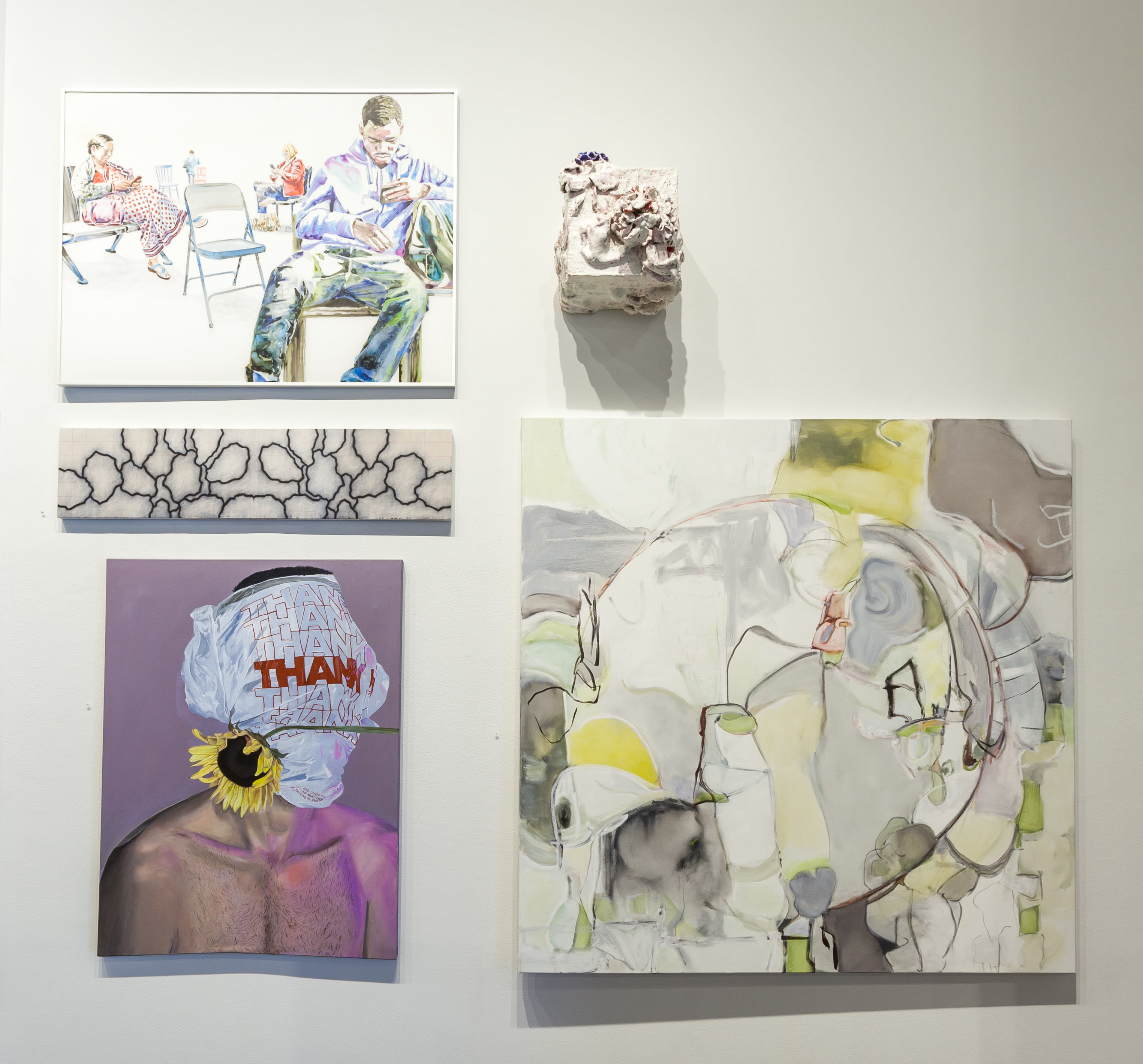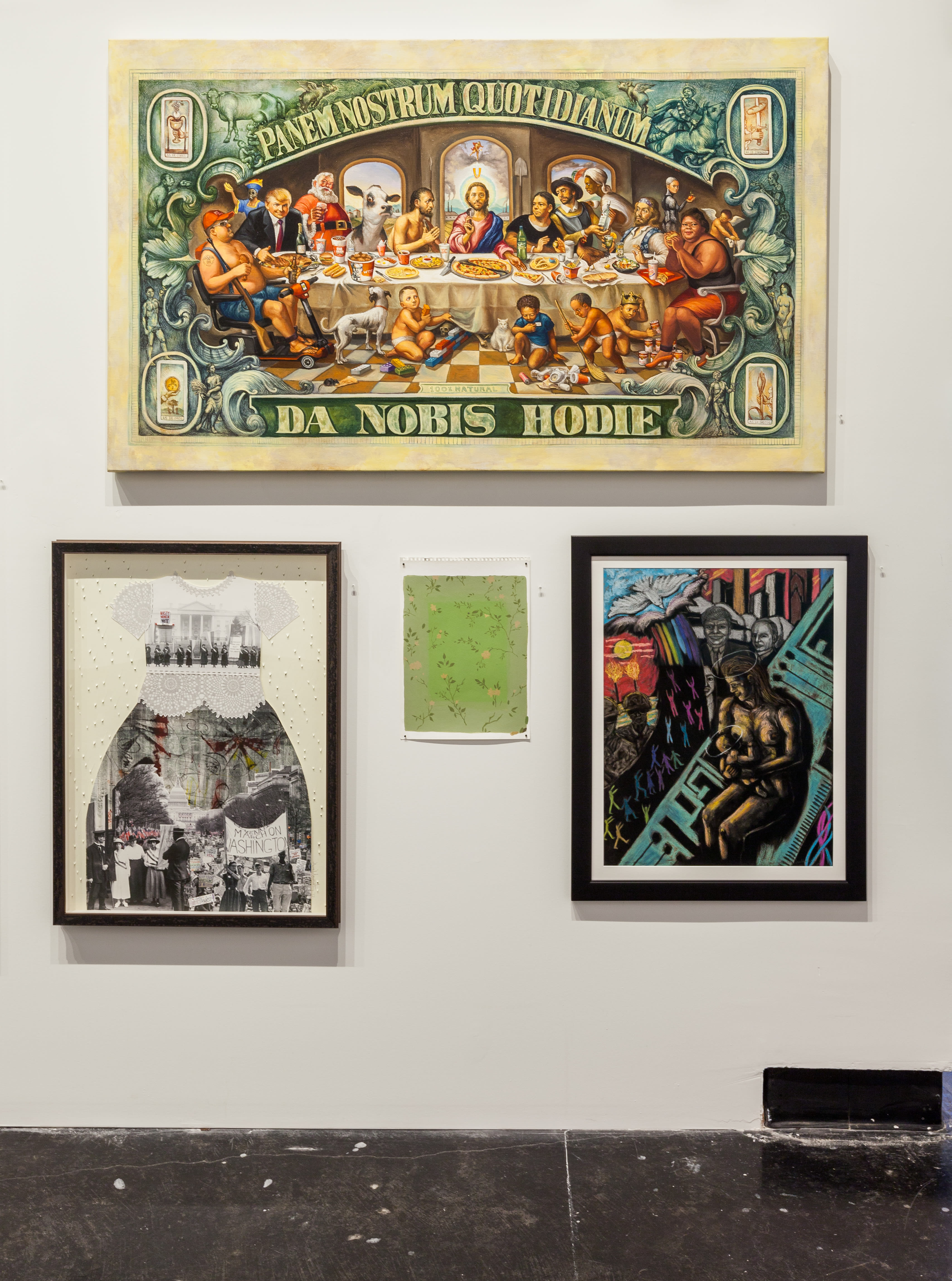 But in our fast-paced, consumer-driven world there’s little time for that kind of sensitivity. We see these personal flaws throughout the show, like humans fueled by greed in Patrick McGrath Muñiz’s parody of The Last Supper painted on a dollar bill. Children sit on the floor sweeping up fast food trash and playing with Campbell’s soup cans, while us adults stare, not at Jesus, but the pizza cutter in his hand. We also see ourselves Lillian Warren's acrylic where four people find lifeblood in tiny rectangular screens. Faces glued to the technology in our laps, A Odd Silence Shook the Room but Nobody Looked Up.