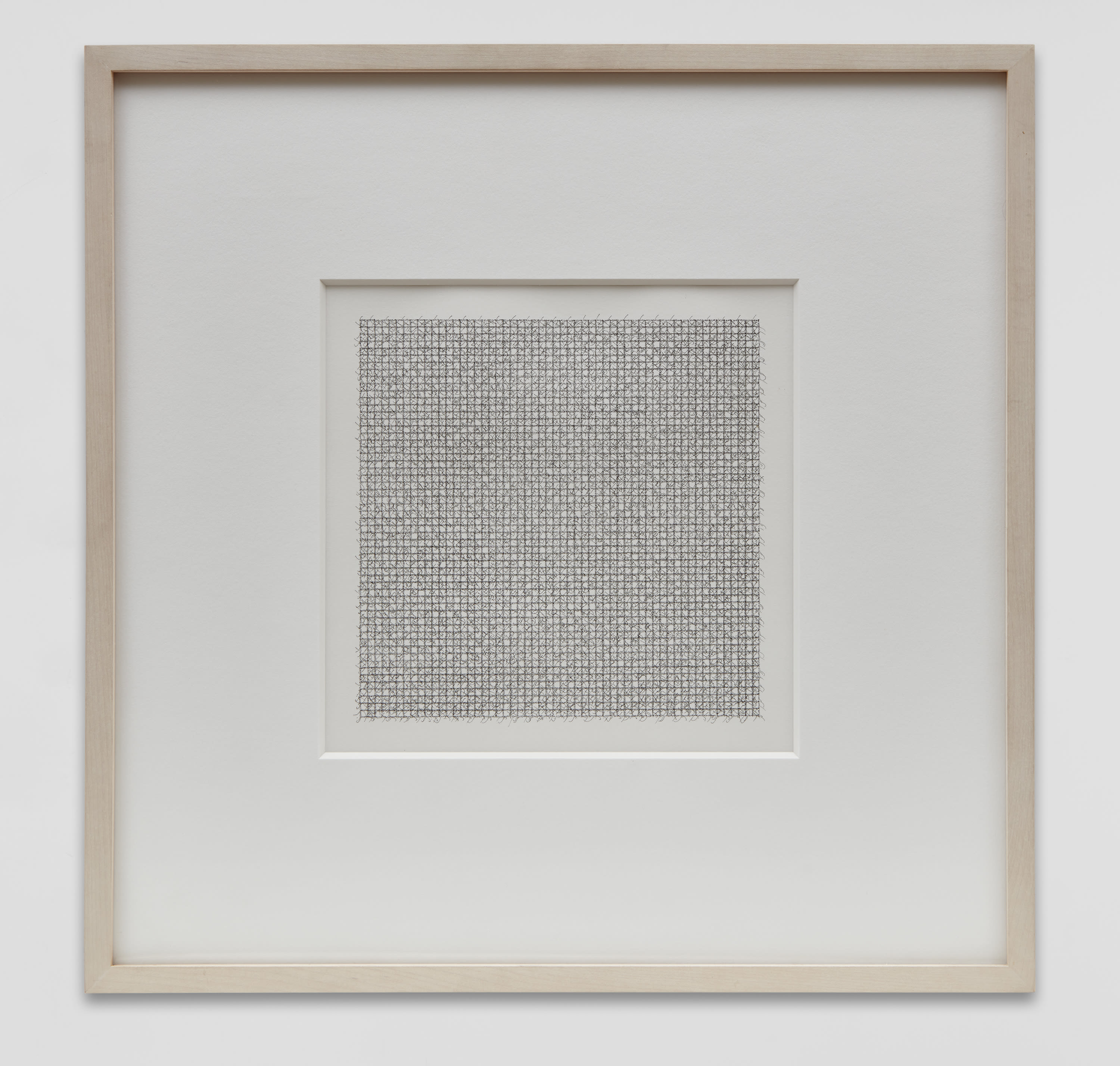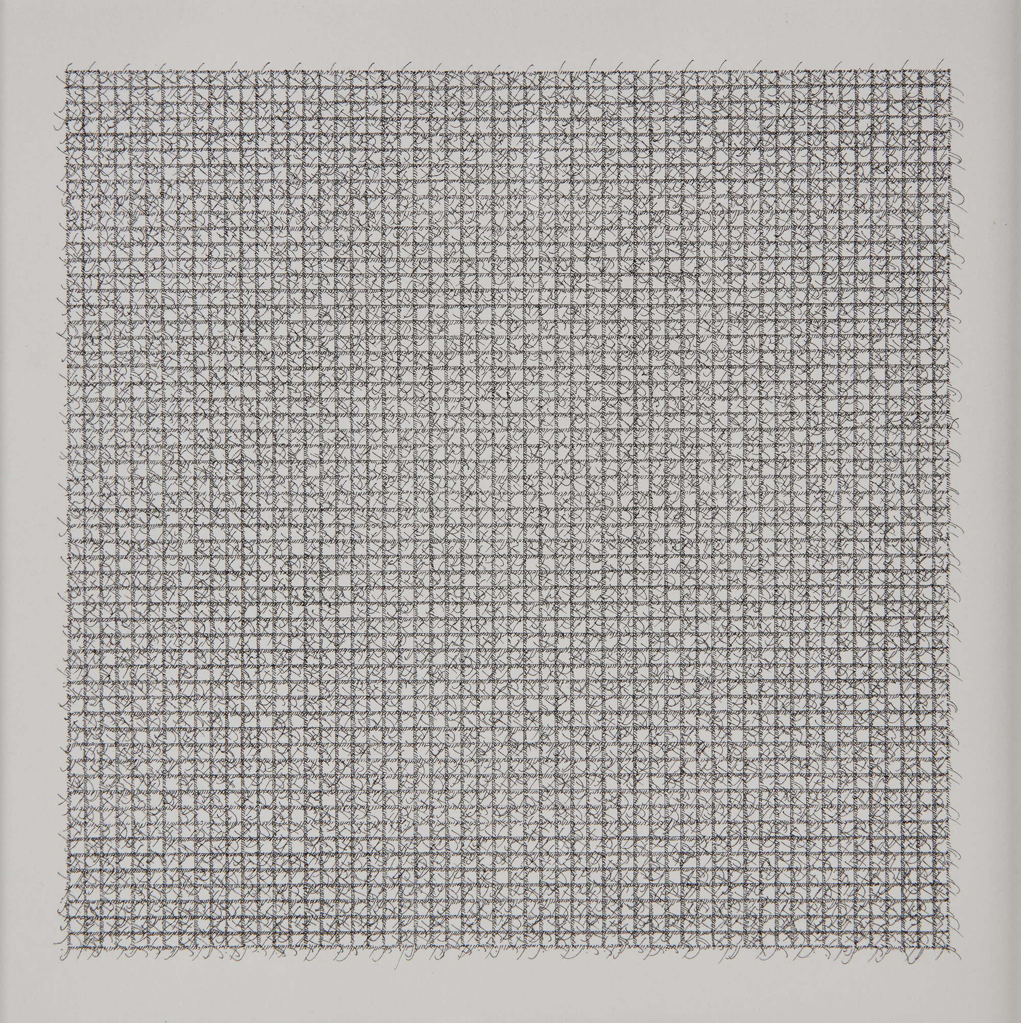 To single out an artist: Moroccan-born Jacob El Hanani takes the title to its mystic extreme, with a small, square work comprised solely of his name scrawled thousands of times in microscopic Hebrew script. From the Signature Series (A84) is a modern riff on the Jewish micrograph, where words are repeated to form visual patterns. This example exudes the mechanical quality of Sol LeWitt as the autographs perfectly tangle into a uniform grid of personhood. A work of impossible, computer-like precision was somehow executed by a single middle-aged man.