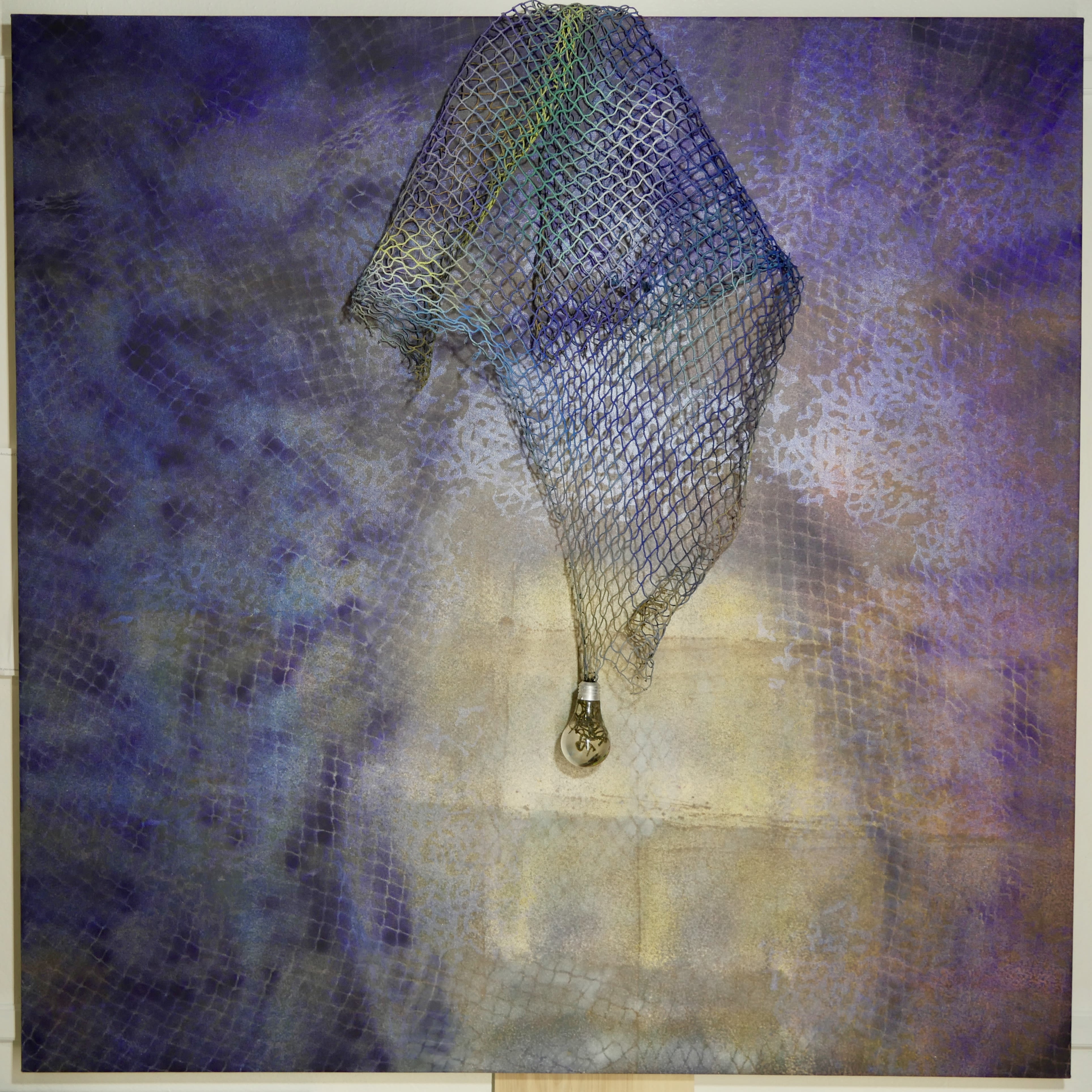 For his part, Lopez’s creative vision breathes across four separate series of painting, sculpture, and installation bound together by inventive use of netting. As a barrier both ephemeral and material, it visually and physically ties the space together. From the distinctly ecological sensibilities throughout the works, to the thoughtful craft-based touches of handmade fly fishing lures suspended in resin, or the custom-made cotton threads recycled from T-shirts, the intentionality of Lopez’s work is on full display. Tying the progression of four different artistic series into one cohesive show also expresses his intent to expand and grow upon himself. From the physicality of Ambiente Chandelier to the neon exploration within the Space is Only Noise That You Can See series, he is constantly self-referencing to iterate and evolve his craft.