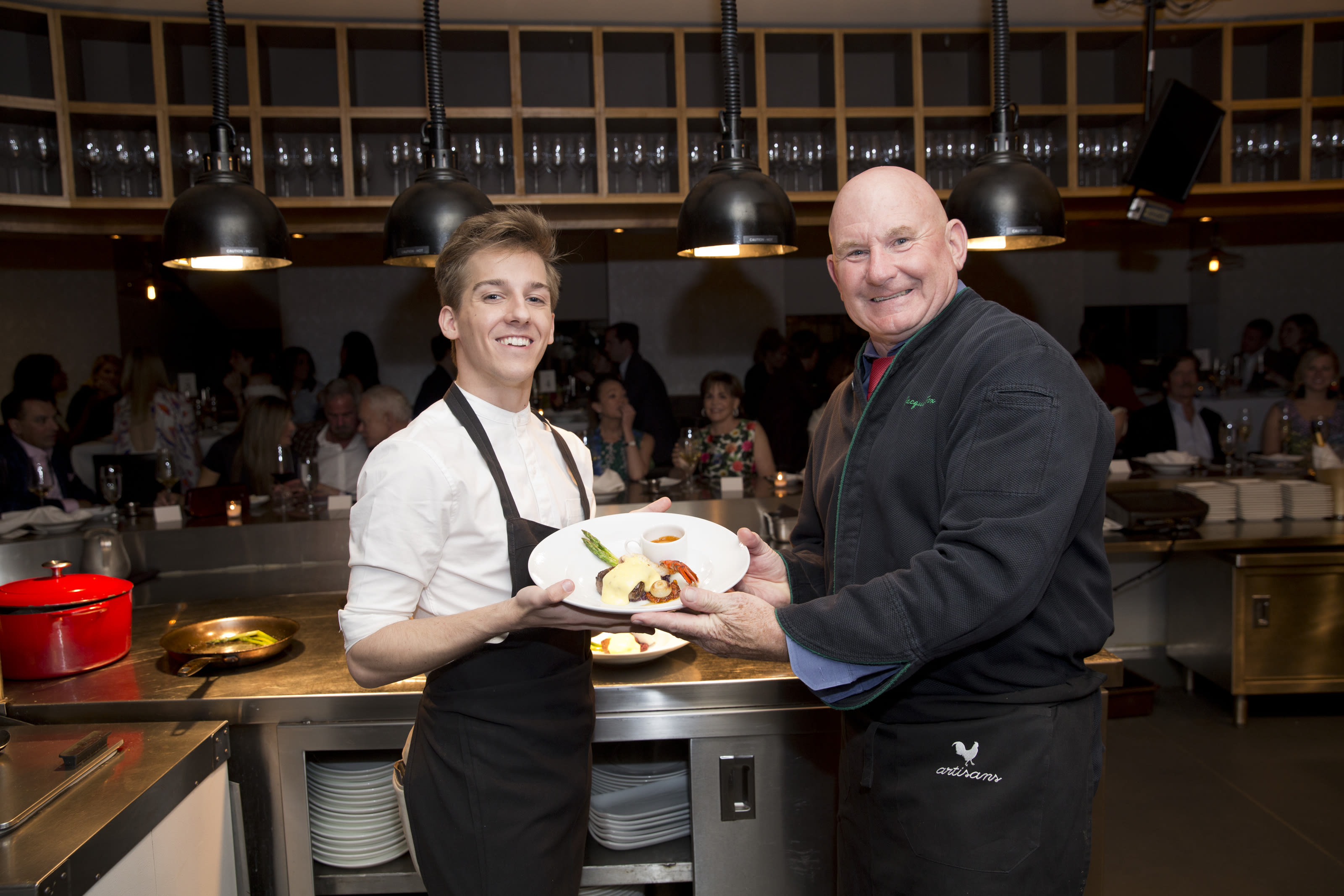 The entrée, created by Artisans’ Owner and CHE Executive Chef Jacques Fox and soloist Hayden Stark, was dubbed “Artisans Tournedos H Stark” and consisted of both steak and seafood with asparagus, Okinawa purple potatoes, carrots puree, lobster butter hollandaise and a raisin demi-glace. The duo developed this dish by looking back on Hayden’s journey as a dancer. “We decided to trace his career and the locations he was able to perform in as well as learn an appreciation for fine foods” said Fox. “Both steak and seafood needed to be on the plate with defined sauces to compliment.”