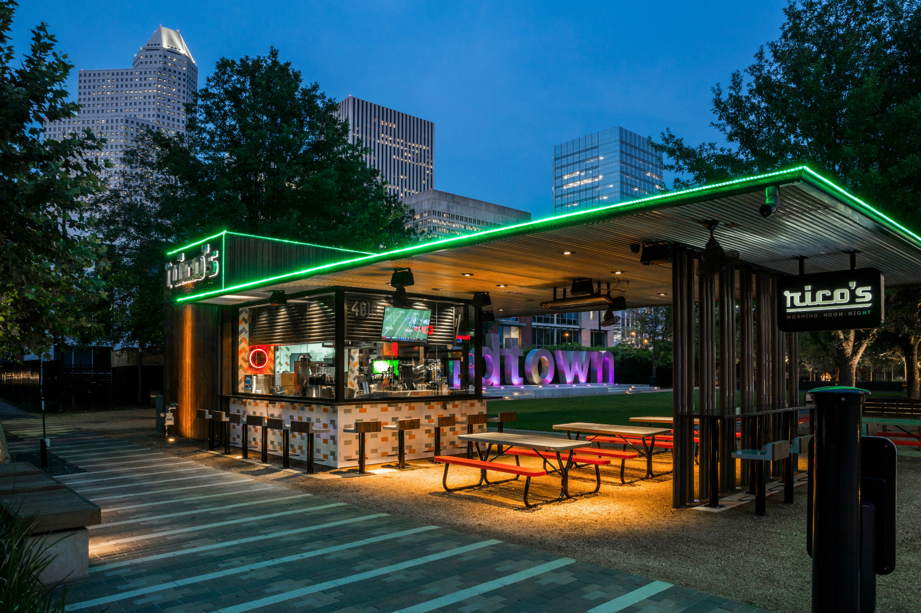 From breakfast tacos and fresh-squeezed OJ for breakfast to Tex-Mex-inspired burgers and hot dogs at lunch and dinner, Rico's Morning + Noon + Night knows what you're craving any time of day—and gets it to you fast. This to-go kiosk in Midtown's busy Bagby Park caters to everyone from downtown businessmen on a break to families frolicking in the park, though we especially enjoy Rico's by night, when it turns into a neon-lit spot for casual romance al fresco.