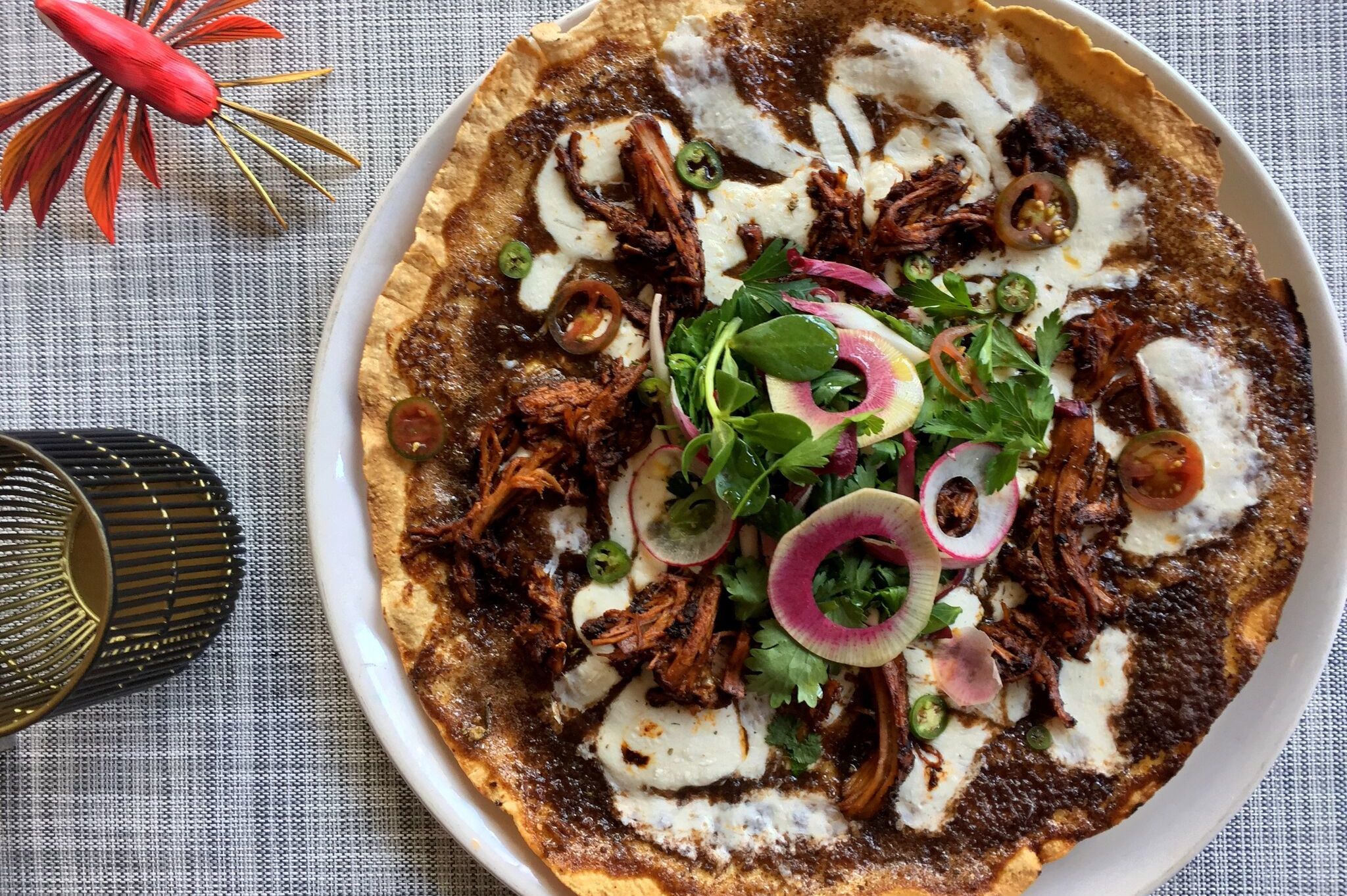 Tlayudas, the traditional street food of Oaxaca, are among the featured menu items at Xochi.