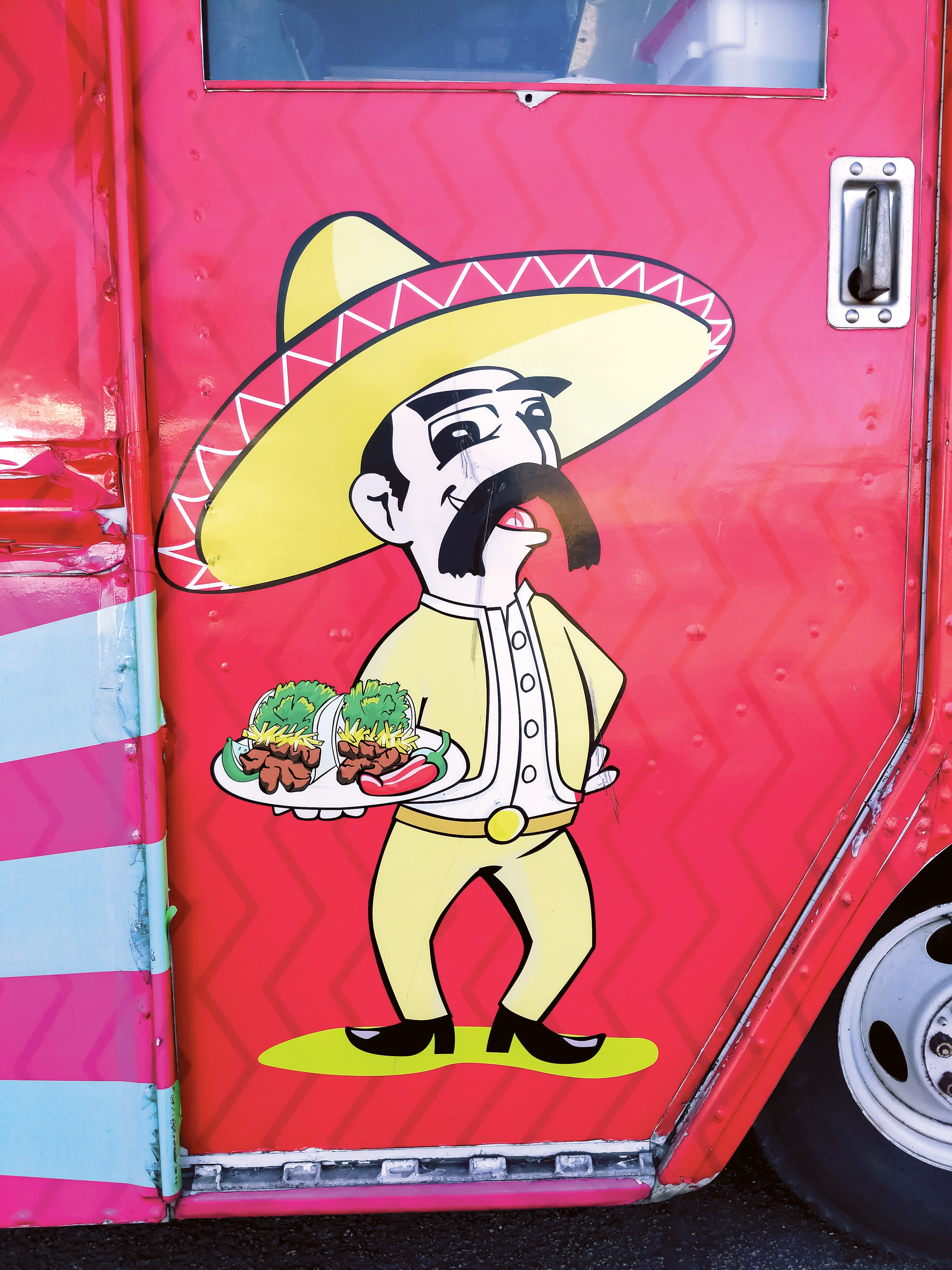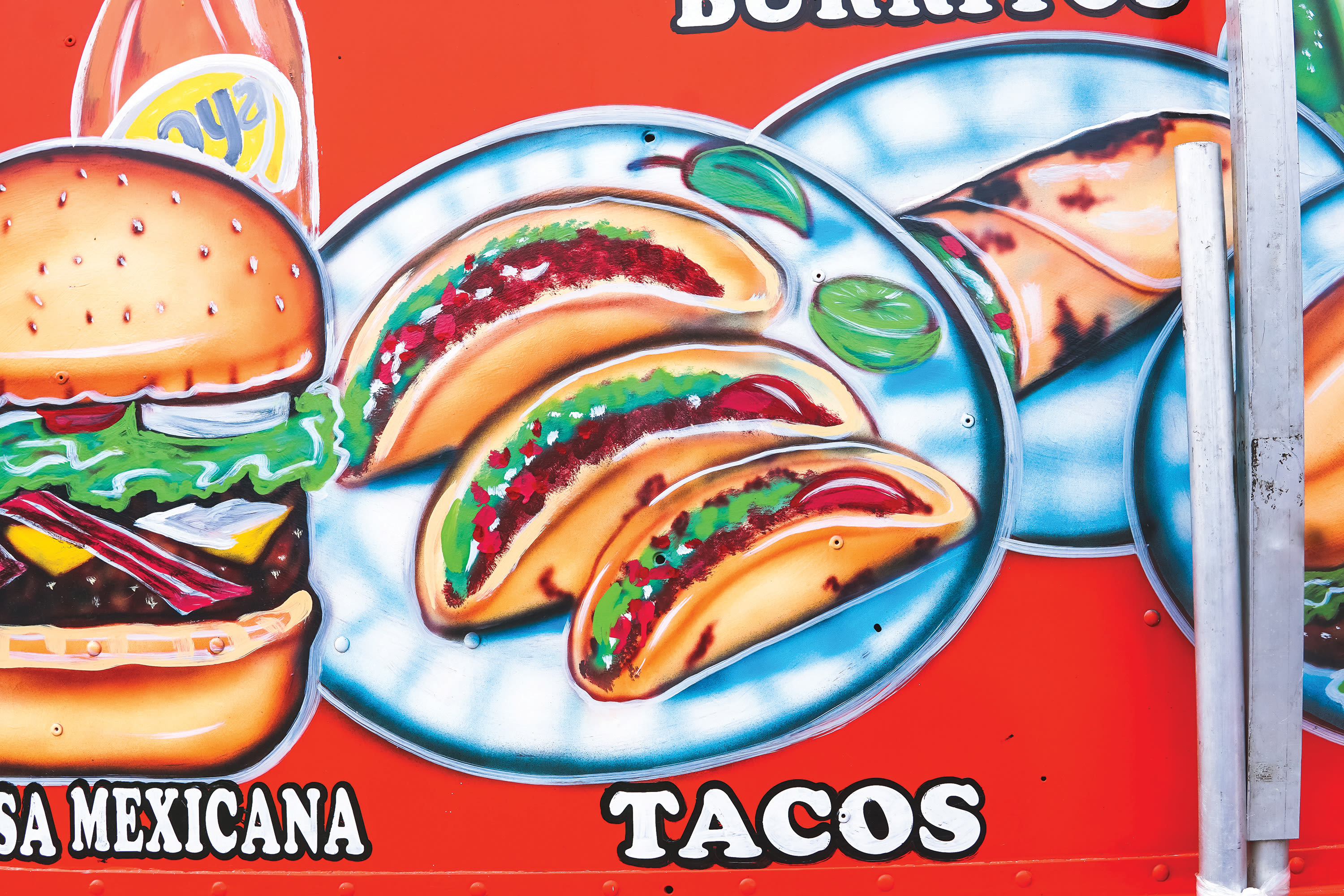 The tradition of hand-painting signs is alive and well in Mexico and among Mexican-Americans. These designs are called rótulos; the artists, rotulistas. Artwork in bold primary colors at taco trucks and taquerías draws in hungry patrons, offering a quick rundown of prices and delicacies. Hand-done caricatures and mascots are cute, but also serve as a memory tool for future reference: Let’s go eat tacos at the truck that looks like a big boom box! Next time you visit your favorite neighborhood taco spot, take a step back to admire the beauty of this artwork before enjoying your edible masterpiece-on-a-tortilla.