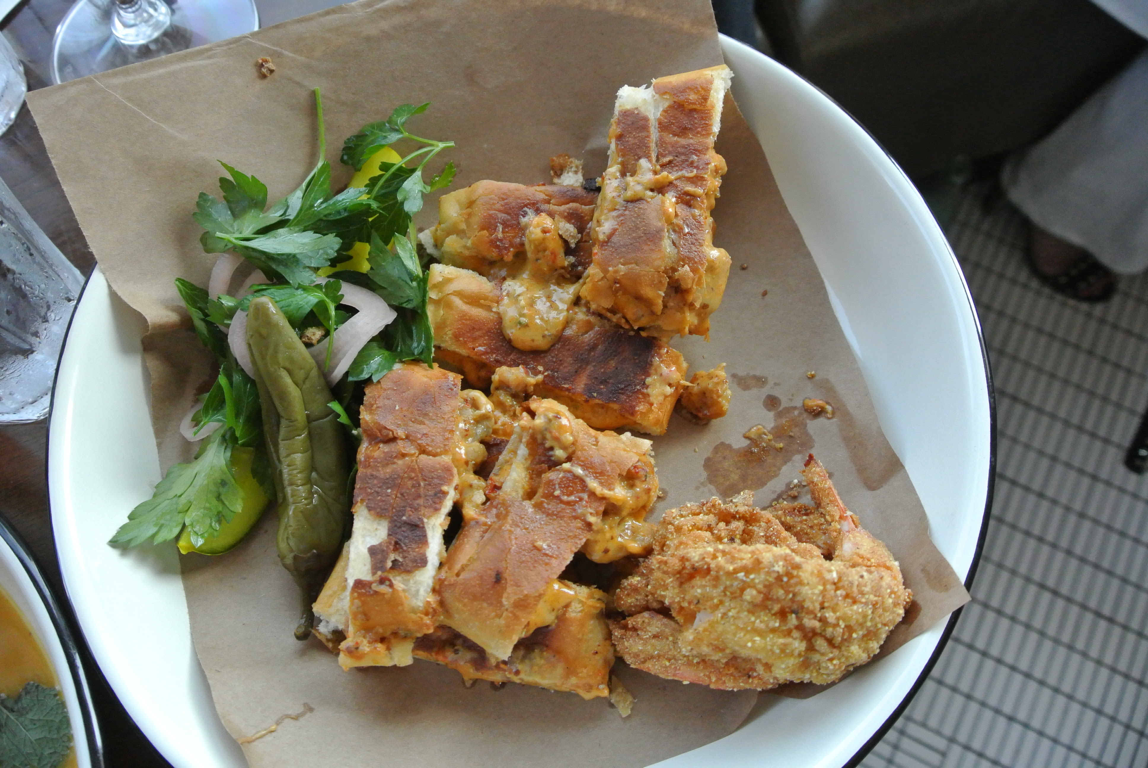A sunny spread of summer comfort welcomed folks at the happy hour. From grilled oysters swimming in either cilantro and serrano butter or chile de árbol butter, to cozy, crispy fried chicken, to savory crawfish tails served between slices of charred Royal Bakery bread, La Lucha is aiming to hit the heart and soul of the Gulf Coast.