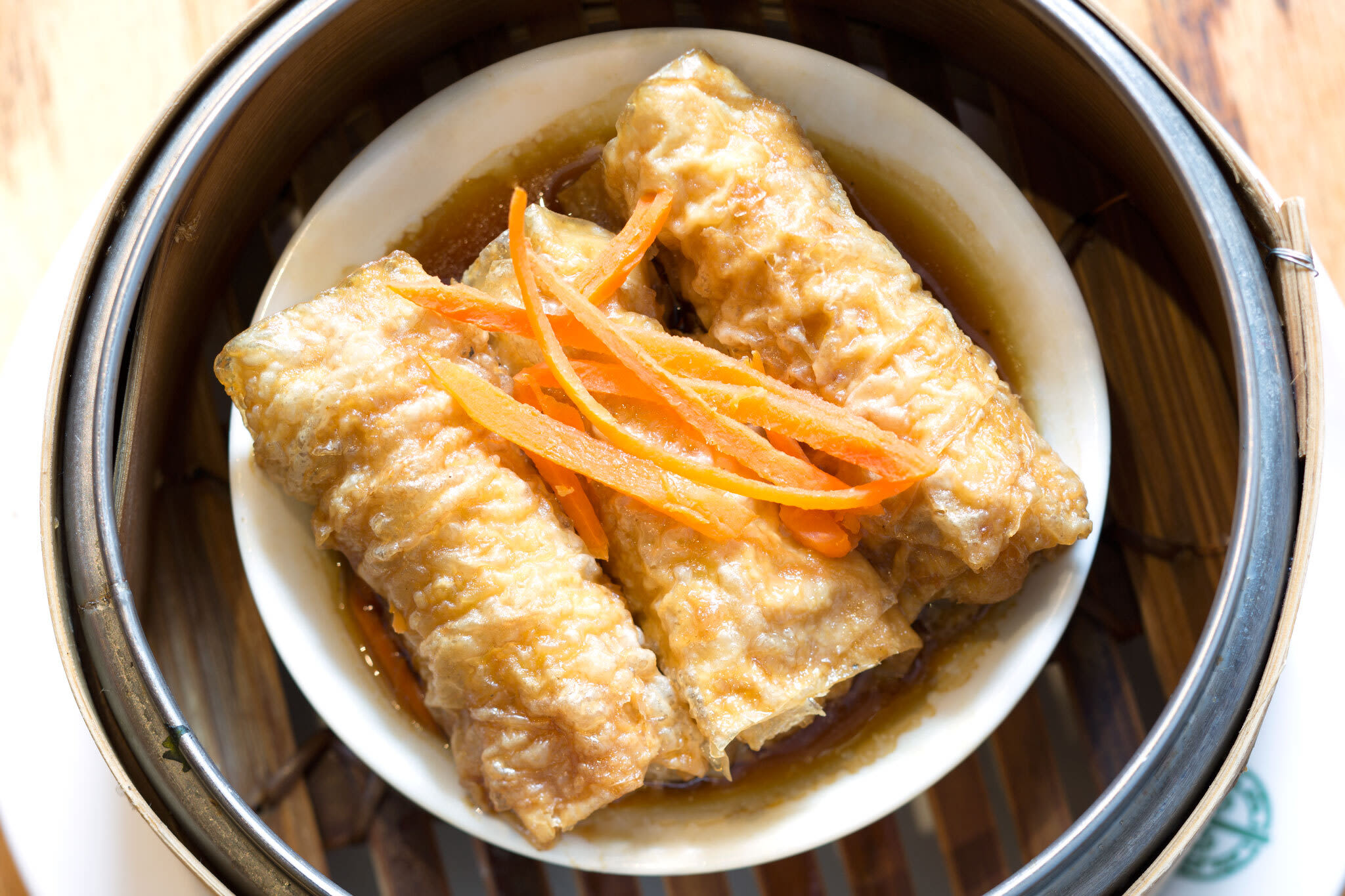 Dumpling fillings are as carefully tailored as the dough hues—the traditional pork filling was tweaked from Lin’s family recipe—but over time the couple has developed additional creative flavors, including a chicken filling, a popular bacon cheeseburger filling, and even vegan fillings. To accommodate my pescatarian requirements, they created a super tasty medley of mushrooms, crystal noodles, and egg.