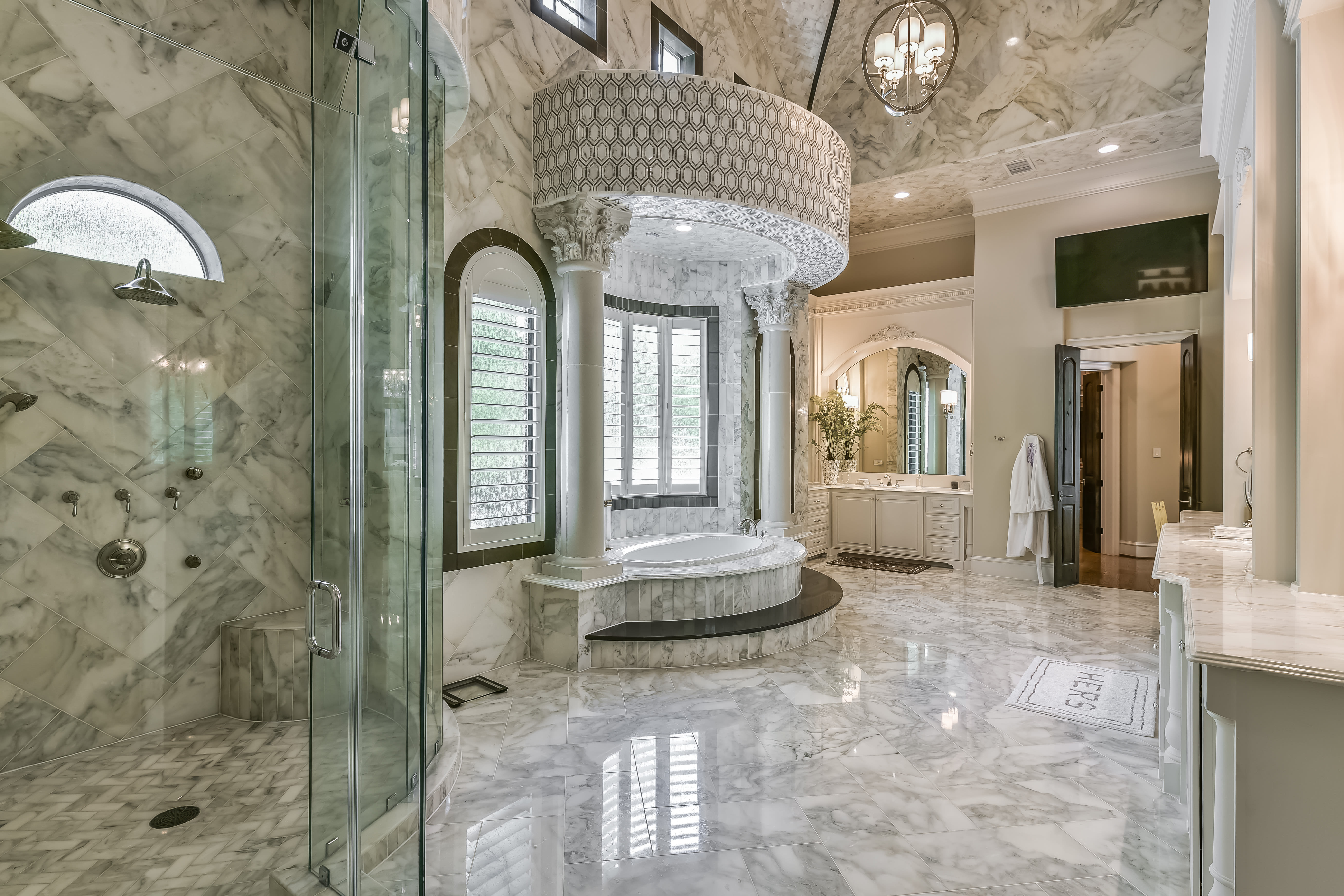 We could spend days in the master bathroom, which—well, to call the floor-to-ceiling stone and porcelain-tiled ensuite complete with giant, marble-encased, column-flanked tub a “bathroom” is an injustice. And if that bathroom is taken? There are 10 more.