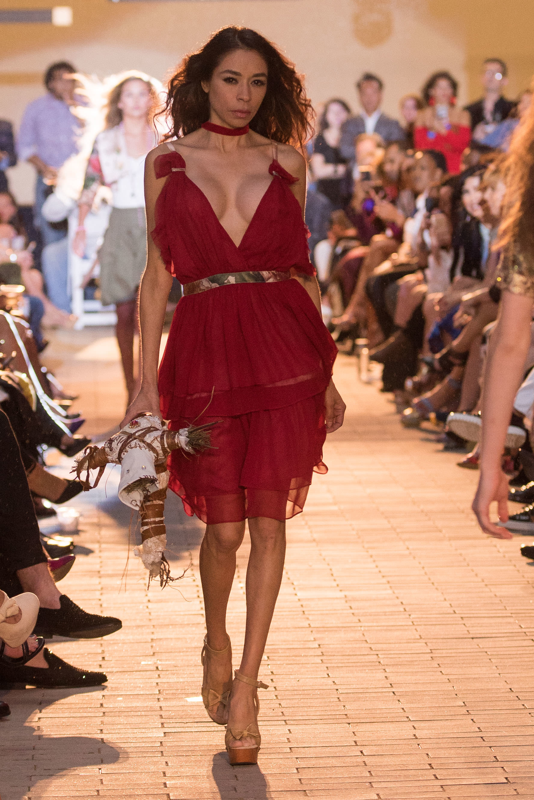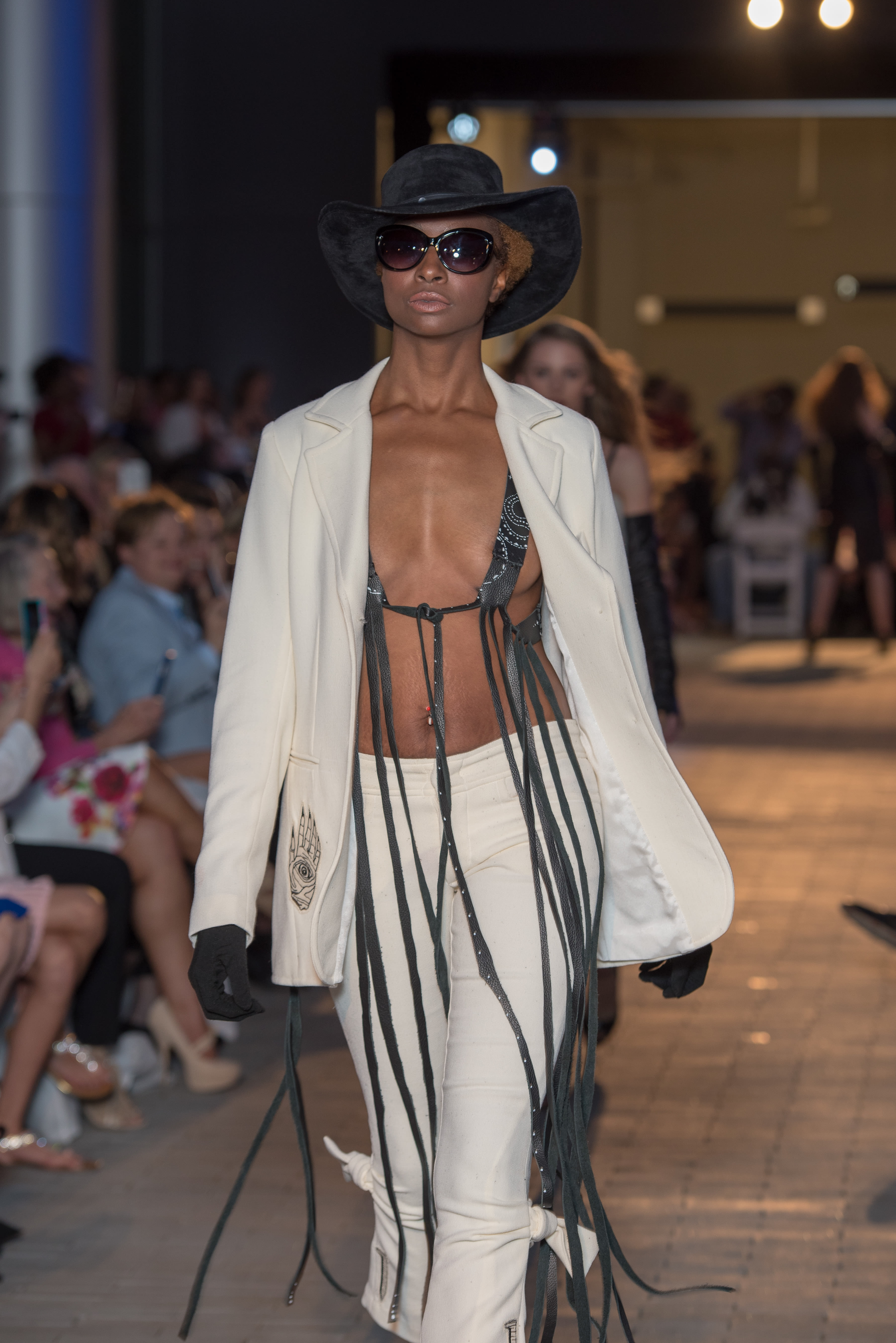 The show opened with the aforementioned Kate Kills Pretty, a line by longtime Houston resident-turned L.A. designer Aries Milan. Models wore Saint Bohemian’s rosary-inspired necklaces as they walked the runway in fitted dresses, two-piece sets, and pantsuits. Milan, the former Coquette Boutique owner, was inspired as a young girl by Kate Moss, for whom she named her line. The supermodel's aesthetic is imbued in Milan's designs—think edgy, cool, rocker-chic.