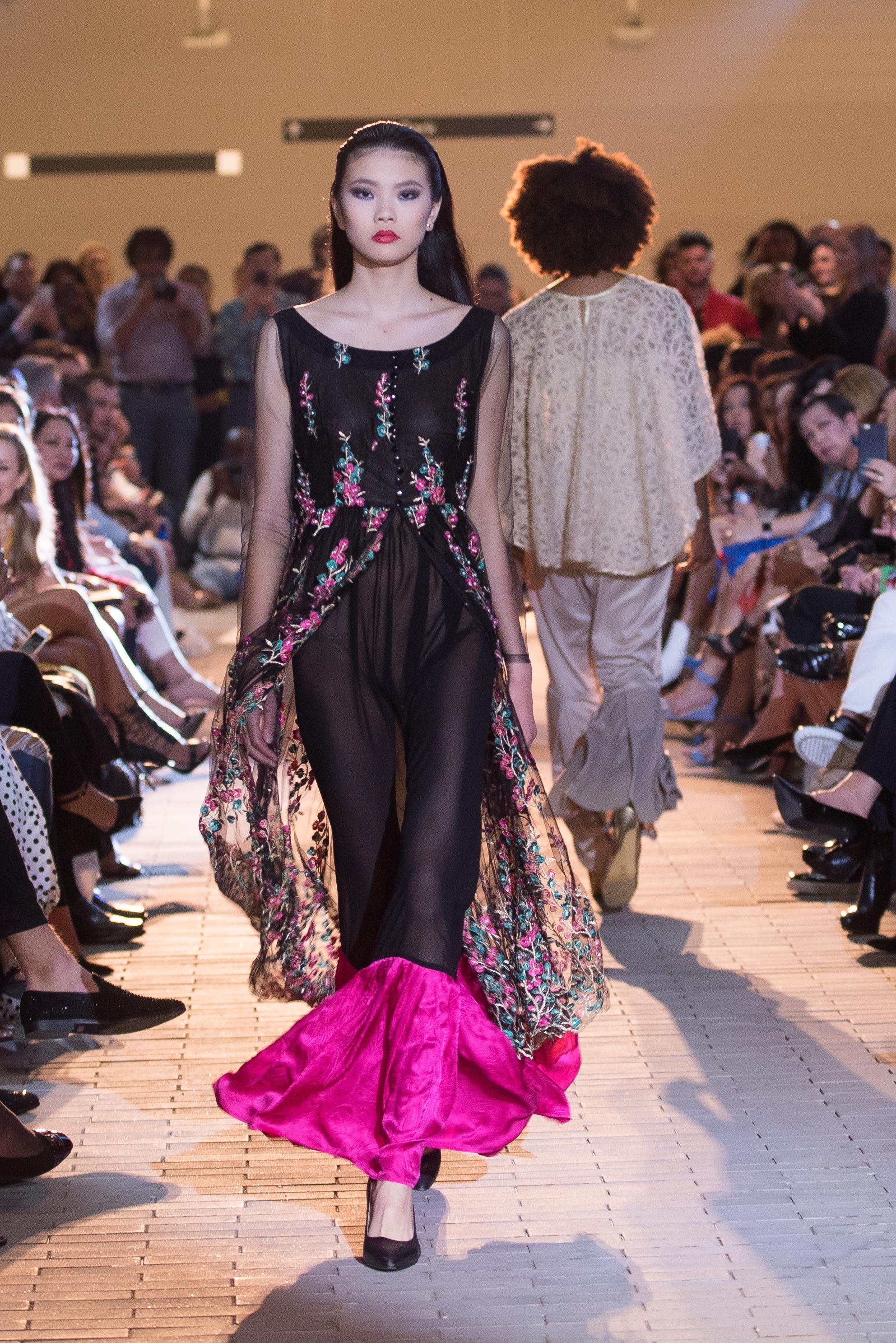 Upstairs, Alantude by Alan Gonzalez, Danny Nguyen Couture and Meru Merus showcased their latest collections, and featured artists included Chuck Redick, Tatiana Escallon, Patti Lennon, and Monica Melgar. Nguyen's upstairs installation featured models in colorful floral prints from the Houston designer's Spring/Summer 2018 Collection; on the runway, Nguyen showed an array of womenswear and menswear suits.