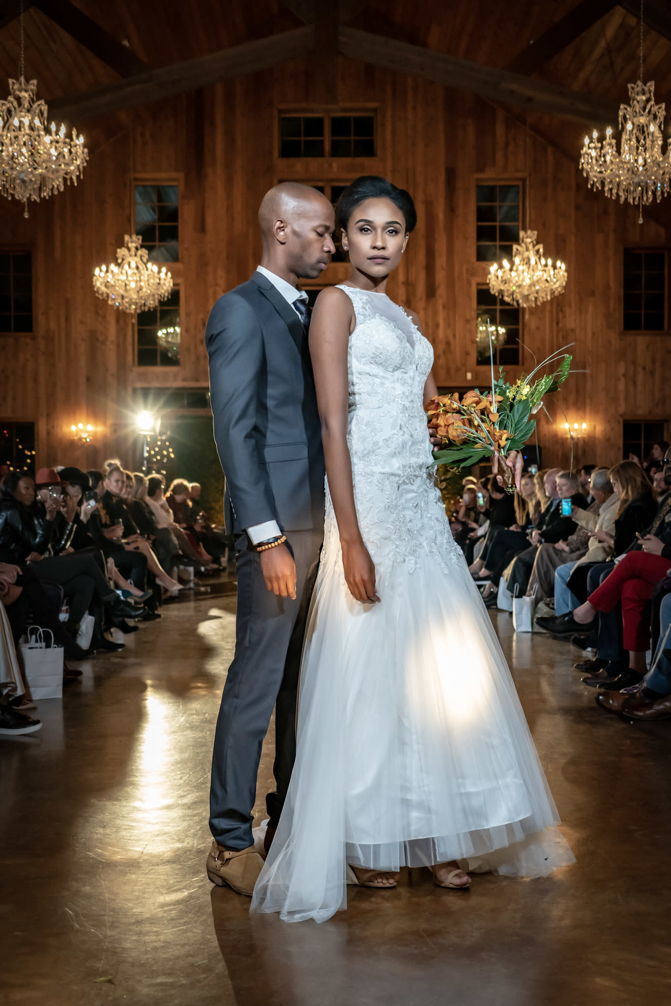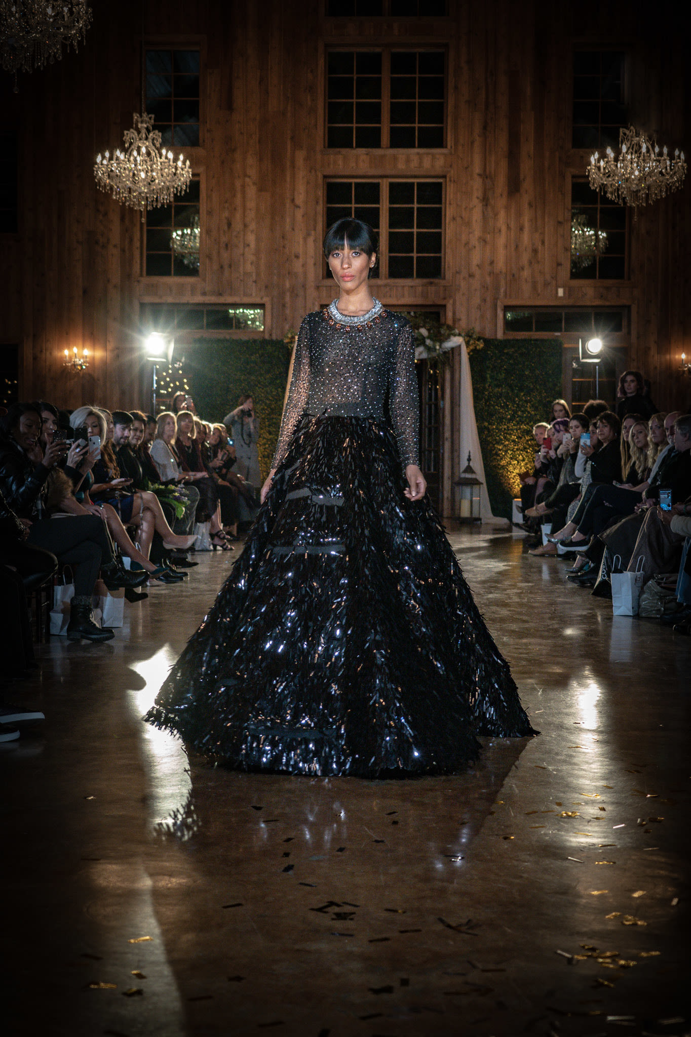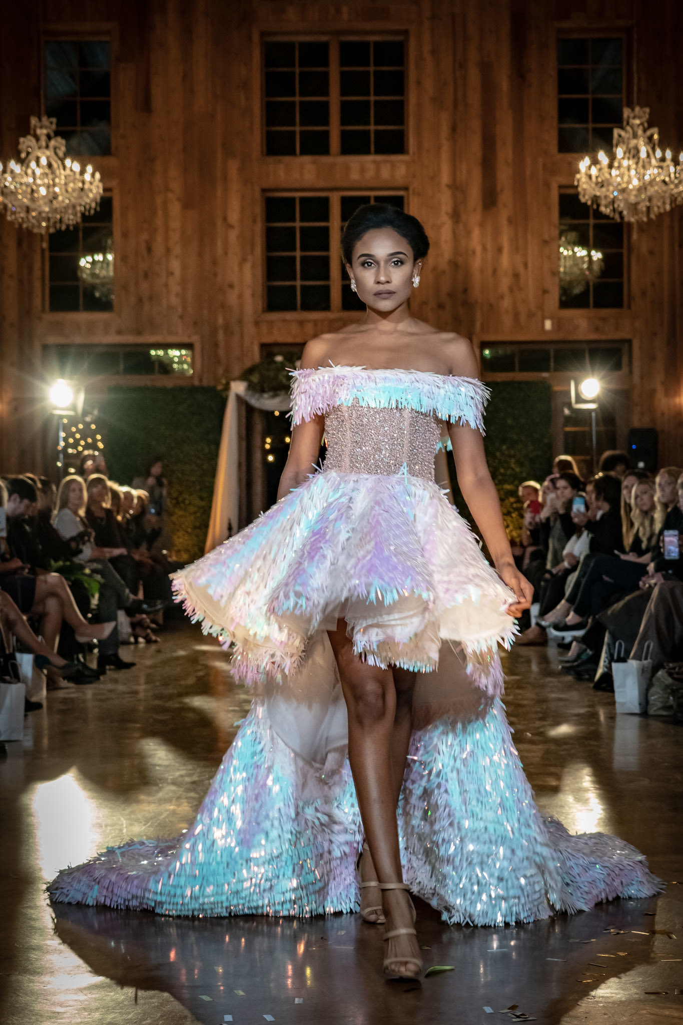 Nguyen told Houstonia he chose the venue based on recommendations from new Outer Loop clients. The Carriage House chapel, a separate space on the property, featured floral gowns from Nguyen's SS18 collection. Metallic and sequined pieces from the FW18 collection lined the aisles all the way to the altar, which held suits and wedding gowns from L'Atelier Wedding.