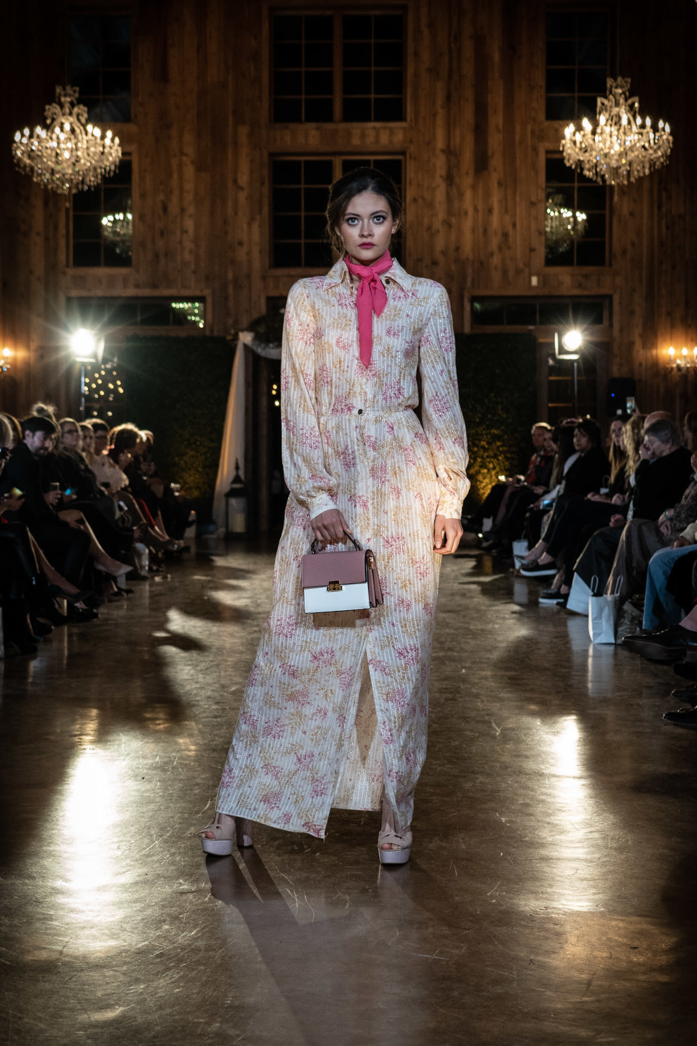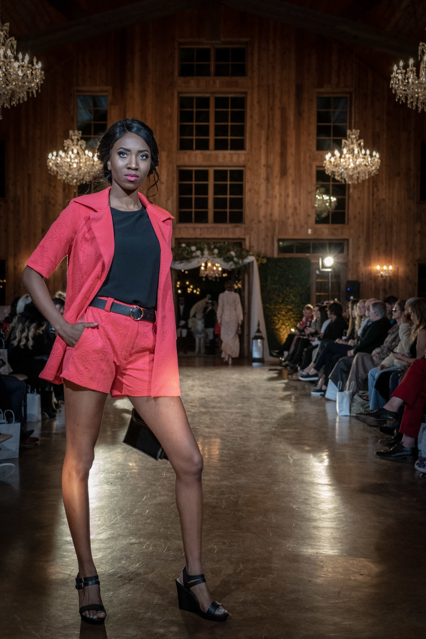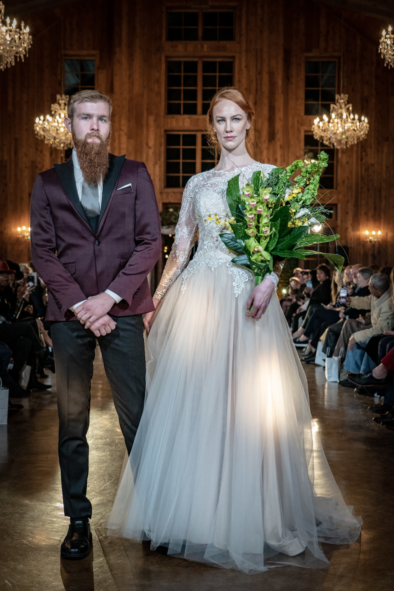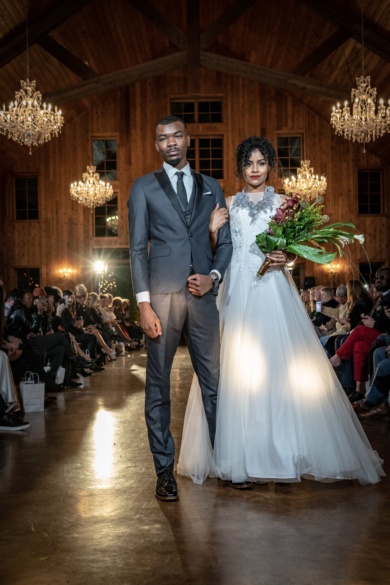 Nguyen told Houstonia he chose the venue based on recommendations from new Outer Loop clients. The Carriage House chapel, a separate space on the property, featured floral gowns from Nguyen's SS18 collection. Metallic and sequined pieces from the FW18 collection lined the aisles all the way to the altar, which held suits and wedding gowns from L'Atelier Wedding.